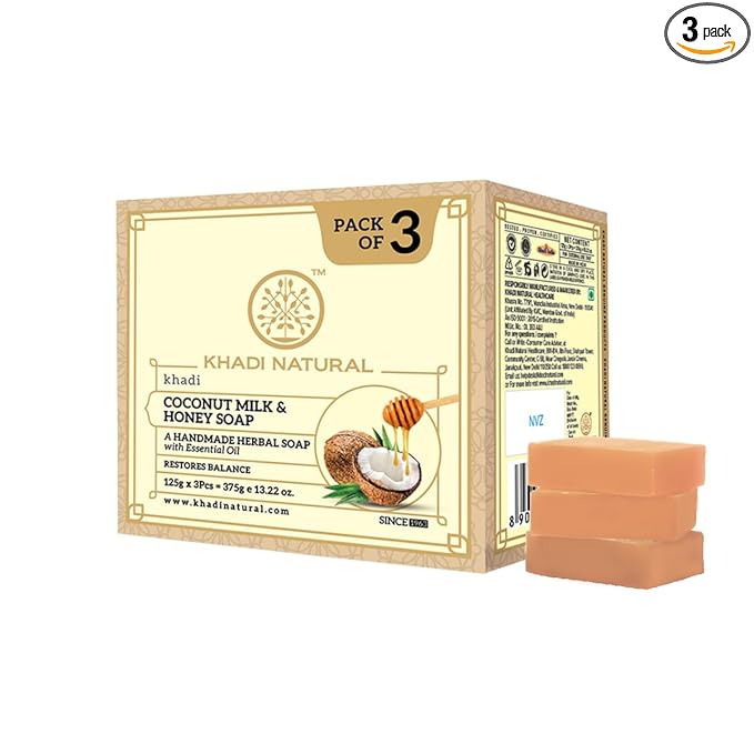 6.Khadi Natural Coconut Milk & Honey Soap | Deeply Moisturizing Bathing Bar with Essential Oils | Free From Harsh Chemicals | For All Skin Types | Pack of 3 (125g x 3, 375g)