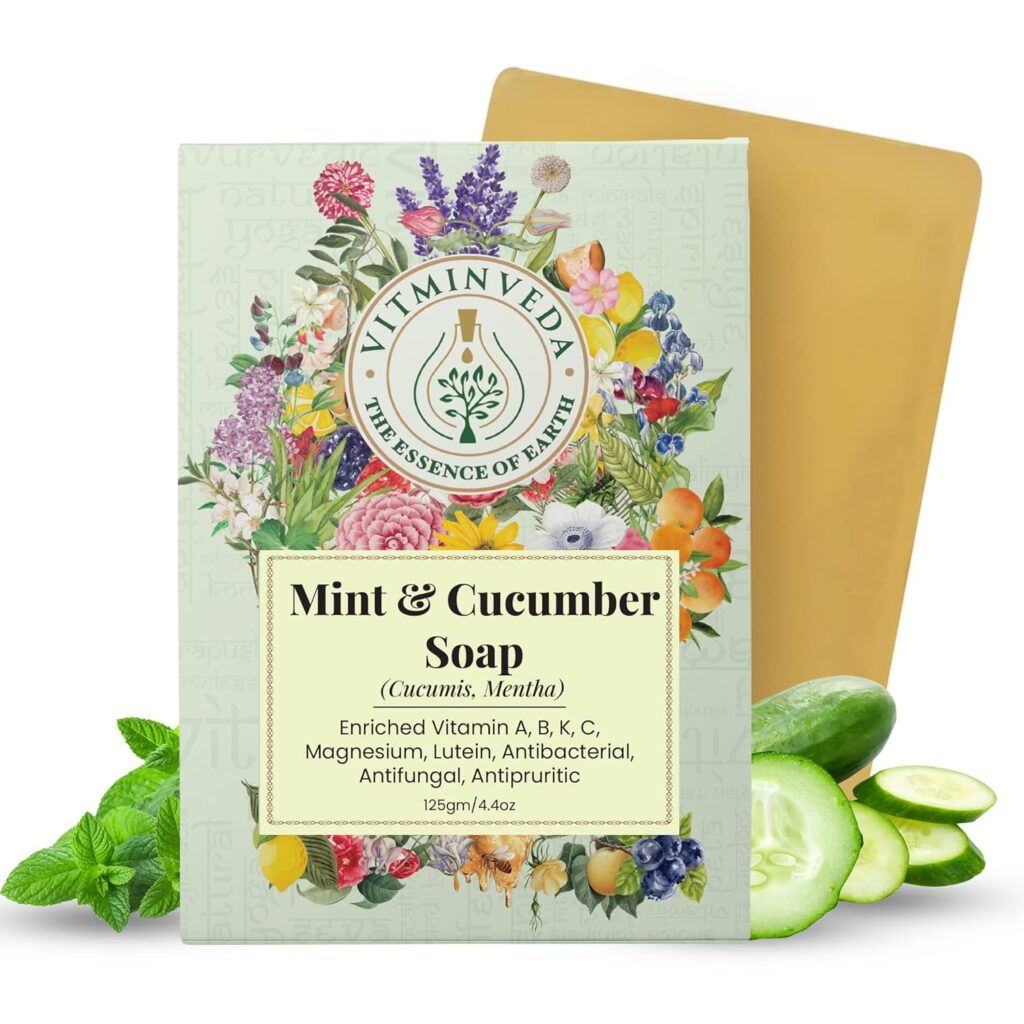 ASTRINGENT AND ANTIBACTERIAL PROPERTIES: Cucumber has astringent properties that can help to tighten pores and reduce excess oil, making it particularly beneficial for individuals with oily or acne-prone skin. Menthol has antibacterial properties that can help to combat acne-causing bacteria, further supporting clear and healthy skin. Experience nature’s purity with our natural VITMINVEDA bath soap for men & women.